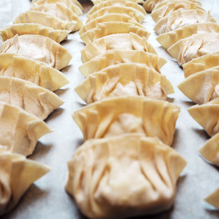 Take a wrapper and put a tablespoon of filling in the center. Dab your finger in some water and run it along the top of the wrapper. Then pinch three folds on the right side with you index finger and thumb, and then three folds on the left side. Repeat and place the filled dumplings on a tray. There are plenty of YouTube videos you can watch to get the wrapping right!